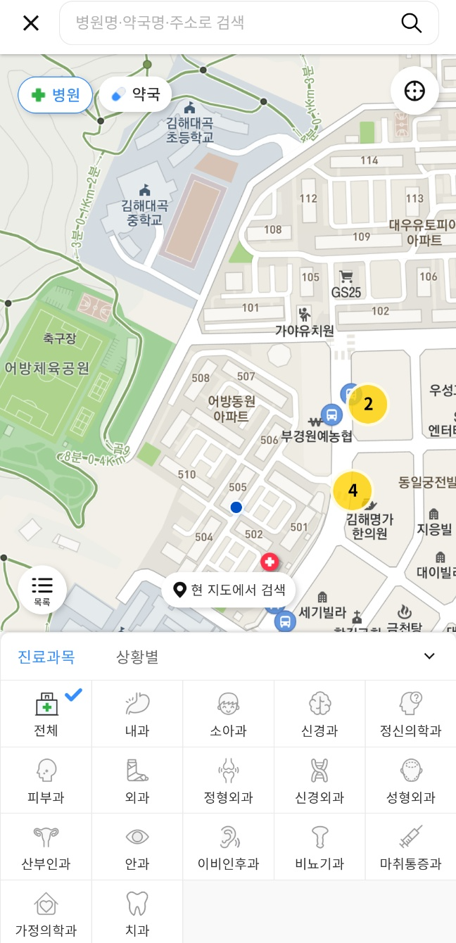 캐시닥에 유용한 기능이 있더라고요. 현재 내 위치에서 주위의 병원과 약국을 표시해주는 기능도 있더라구요. 잘 아는 우리 동네라면 상관없지만 어디 여행을 가거나 했을 경우에 유용하게 사용할 수 있겠더라고요.