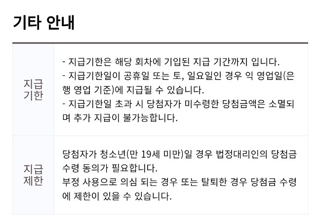 당첨기준은 로또와 같답니다 1등은 6개 번호 일치되면 1,000만 포인트 2등은 5개 번호 일치+보너스번호 일치 되면 100만 포인트, 3등은 5개 번호 일치 100만 포인트를 나누어 주는데, 다수 당첨자 발생 시 그 당첨자 수만큼 총당첨금을 나눠서 즉 1/n을 해서 받을 수 있답니다.