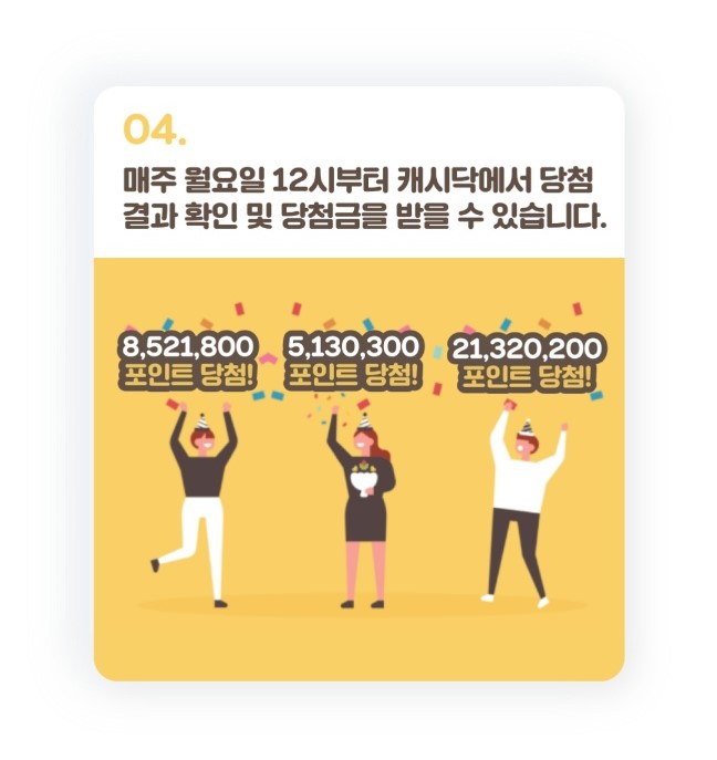 당첨결과는 로또발표하는 토요일이 아니라 매주 월요일 12시부터 캐시닥에서 당첨 결과 확인 및 당첨금을 받을 수 있답니다!! 당첨금은 모두 포인트로 받을 수 있어요. 저는 맨날 5등만 걸리더라고요...;;;;; 몇백 장 중에서 5등만.... 있어요... ㅠㅠ