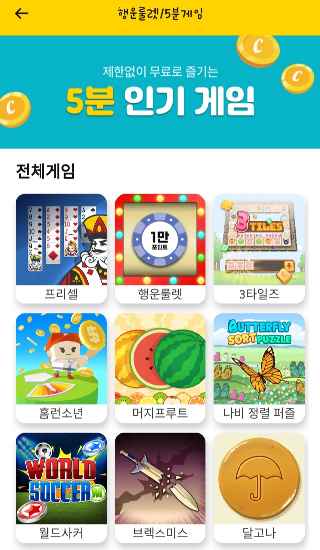 캐시워크에도 있는 5분 게임과 행운룰렛이 그대로 있답니다. 행운룰렛은 광고 1개를 시청하면 5번을 도전할 수 있어요. 꽝없이 포인트를 준다고 합니다. 그리고 5번이 끝나도 광고를 시청하면 5번을 다시 돌릴 수 있어요.