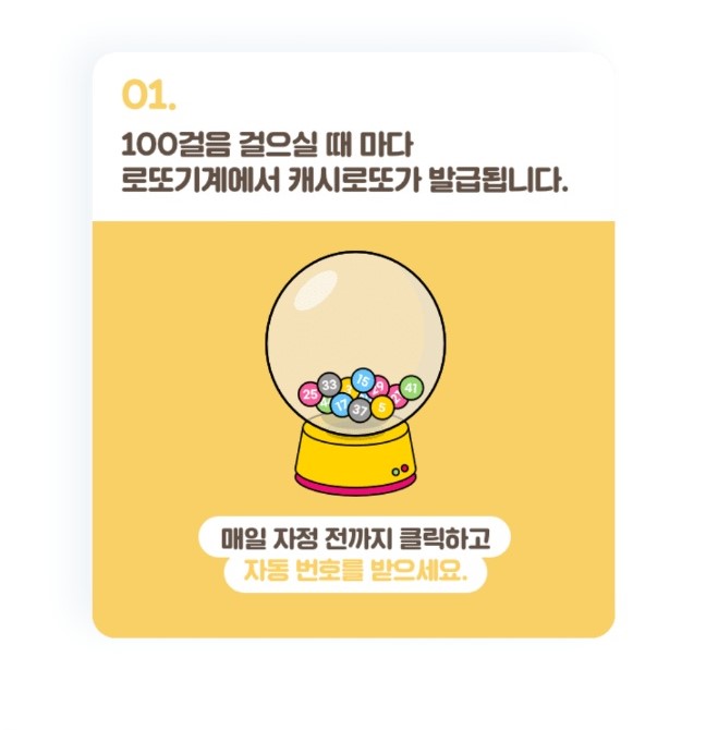 캐시로또는 실제 로또 당첨번호 그대로 당첨된답니다. 앞서 말한 것처럼 100걸음 걸을 때마다 캐시로또 한 장씩을 받을 수 있답니다. 하루에 1만 걸음 총 100장의 캐시로또를 받을 수 있어요. 캐시워크와 마찬가지로 매일 자정 전까지 클릭을 하셔야 한답니다. 아니면 캐시로또가 사라져요.!!