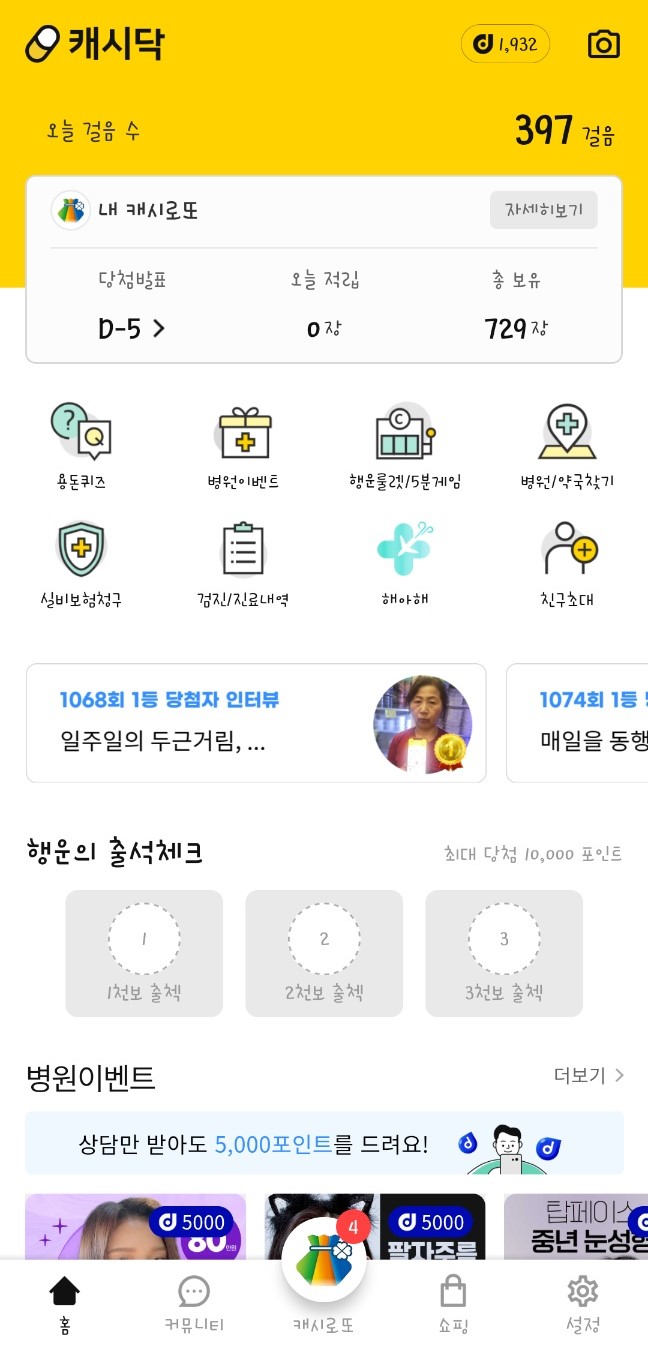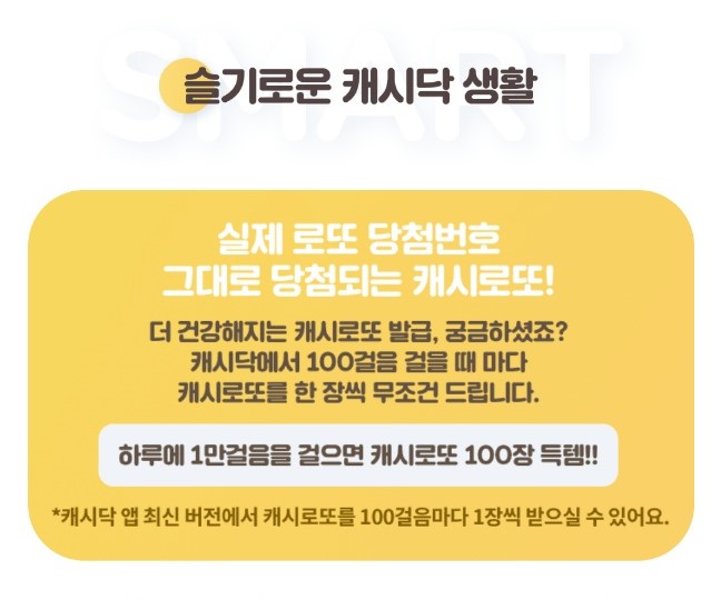 캐시닥은 캐시워크와 마찬가지로 걸은 만큼 캐시로또를 발급해 준답니다. 어차피 아침에 걸어서 캐시워크 포인트도 받으니 겸사겸사 같이 해보았답니다. 100보당 1 캐시로또가 지급됩니다. 하루 만보까지 100 캐시로또를 받을 수 있어요. 캐시로또 = 로또 조합 번호입니다.