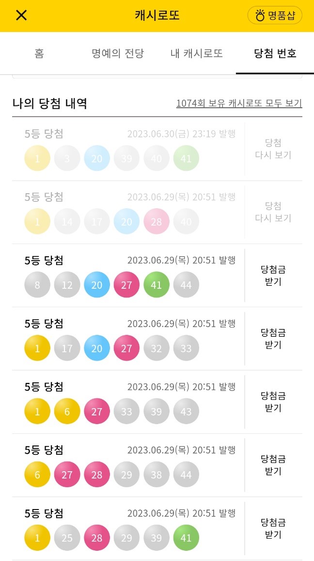 발급된 캐시로또 번호는 내 캐시로또에 차고차고 쌓이게 된답니다. 진짜 로또번호와 동일하다고 해요. 흠.... 진짜 로또 1등 하고 싶습니다. ㅠㅠ 한데 진짜 로또와는 다르게 하루에 100장씩을 받을 수 있으니 확률은 훨씬 더 높아지겠죠????