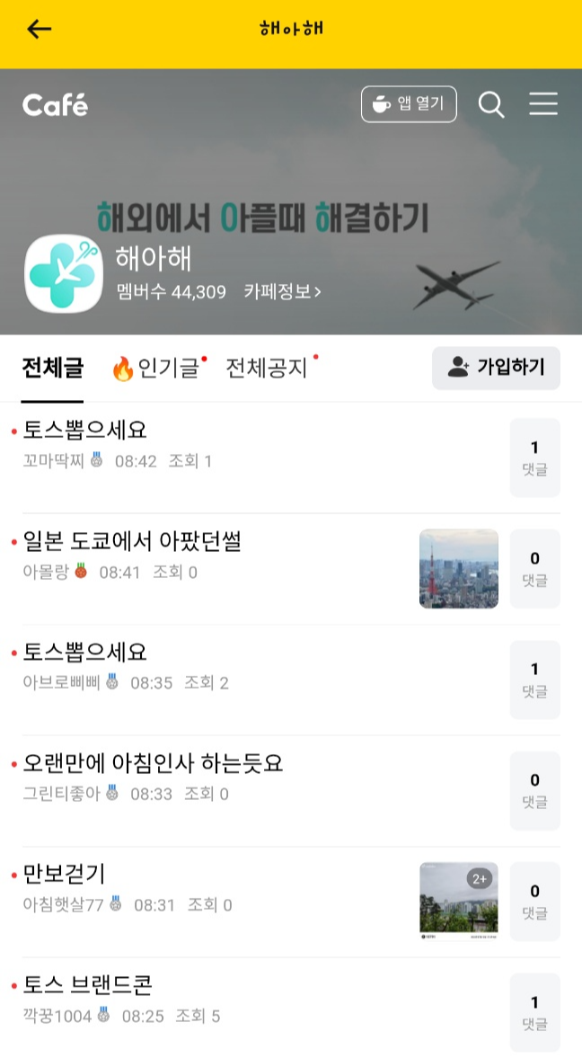 이건 카페에 가입하는 거더라고요. 해외에서 아팠을 때 어떻게 했는지 공유하는 카페인듯해요. 아이들과 해외를 많이 다니시는 분이라면 많은 도움이 될 것 같아요.