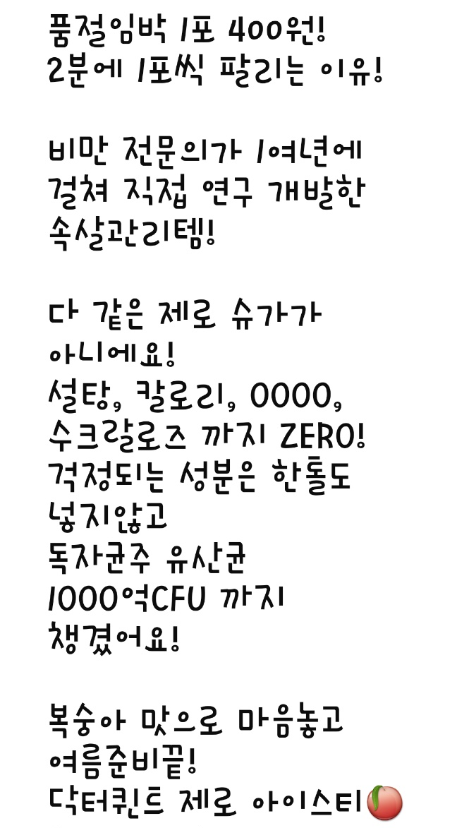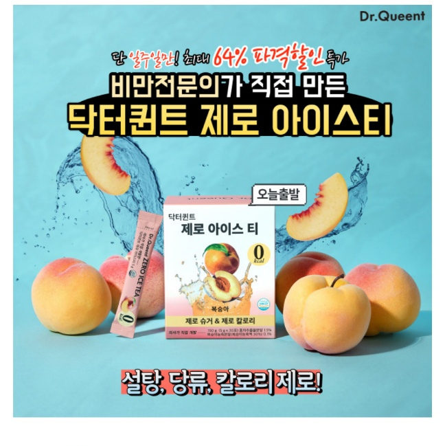 품절임박 1포 400원 ! 2분에 1포씩 팔리는 이유 ! 비만 전문의가 1여년에 걸쳐 직접 연구 개발한 속살관리템! 다 같은 제로 슈가가 아니에요! 설탕, 칼로리,ㅇㅇㅇㅇ, 수크랄로즈까지 ZERO! 걱정되는 성분은 한톨도 넣지않고 독자균주 유산균 1000억 CFU까지 챙겼어요! 복숭아 맛으로 마음놓고 여름준비끝! 닥터퀸트 제로 아이스티(ㅇㅅㅍㅌ)